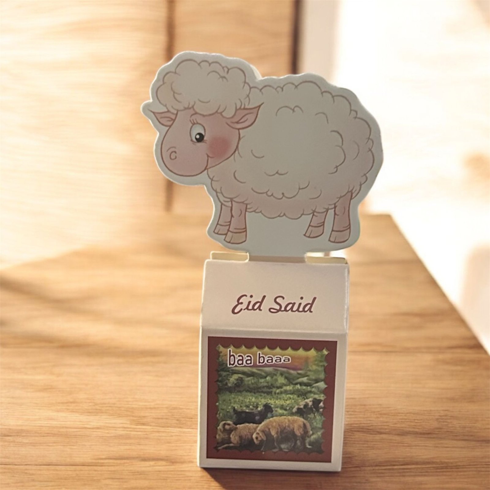 علبة صغيرة بتصميم ناعم، مزينة برسمة خروف كرتوني لطيف بالأعلى، تعطي إحساس بالبراءة والفرح. مكتوب عليها Eid Said بطريقة أنيقة، ومع صورة خراف بالأسفل تضيف جو ريفي دافئ. هدية مثالية للأطفال أو لتوزيعات العيد، تجمع بين البساطة والبهجة بروح العيد الجميلة 🌙�